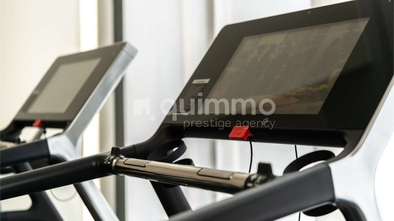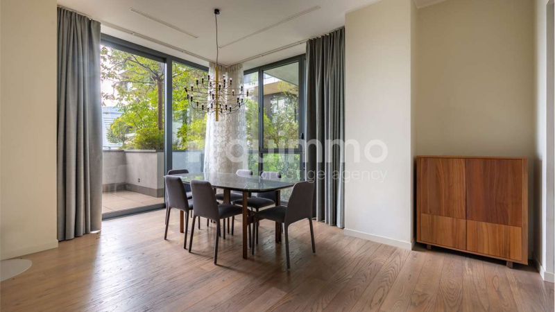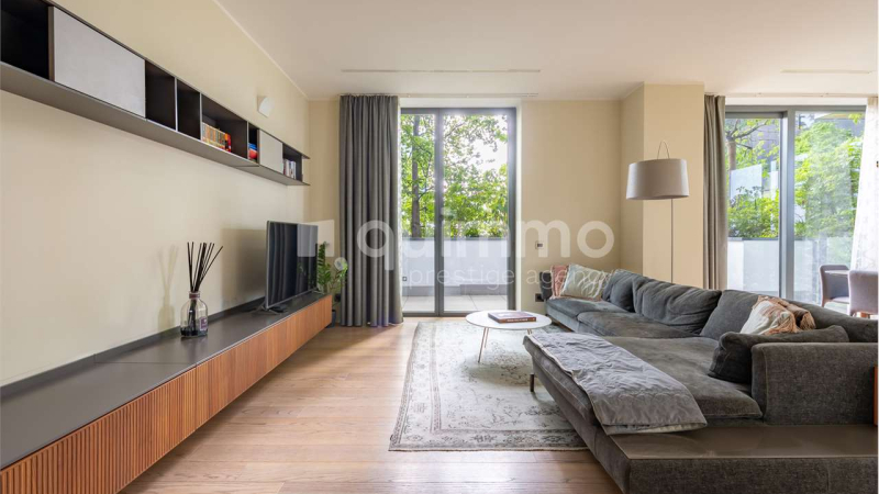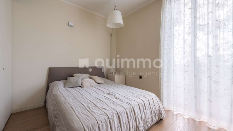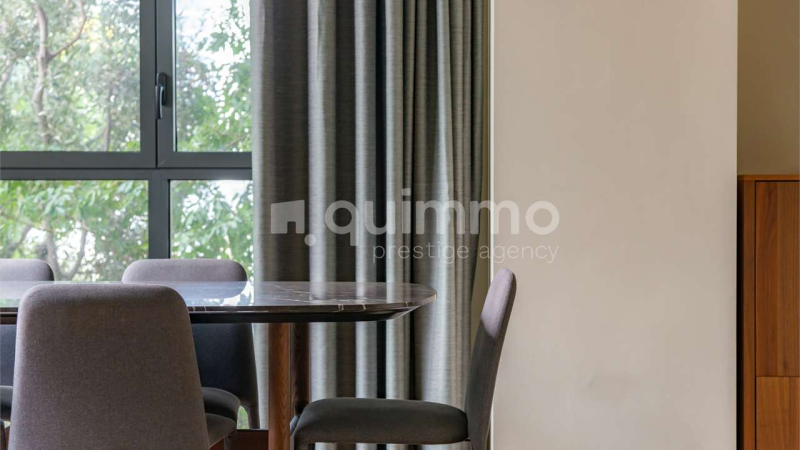 The fully furnished residence, outfitted with bespoke interior design and top-quality finishes, opens onto a spacious entrance hall leading to a bright living area with full-height windows and direct access to the terrace, the perfect spot for open-air relaxation or entertaining.