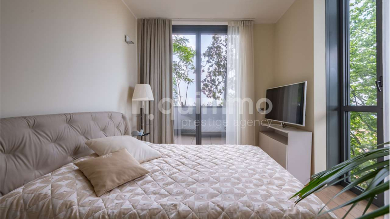 The sleeping area, carefully planned to offer privacy and comfort, includes a master bedroom with walk-in closet, en-suite bathroom with both bathtub and shower, and direct access to the terrace, which is also shared with the second bedroom.