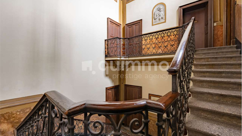 A magnificent staircase adorned with wrought iron, stuccoes, and frescoes leads to the upper floors, where further 19th-century decorative elements can be found. The building benefits from full-day concierge service, a rare feature today in historic properties of this calibre.