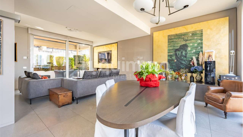 The upper floor, accessible via a private elevator, includes a sophisticated climate-controlled veranda with a dining area, kitchenette, and a comfortable TV and reading lounge. The expansive terrace, ideal for hosting events and receptions, features a pergola-covered bar area, a professional-grade stainless steel outdoor kitchen, a barbecue area with tables, comfortable sofas, and chaise longues for the solarium.