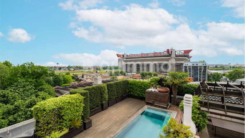 In the most exclusive residential complex in San Siro, in the quiet and private via Fetonte, we offer for sale a highly representative penthouse: 360 sqm apartment + 180 sqm of extraordinary terrace/roof garden embellished with a private swimming pool, a true suspended oasis in the heart of Milan, with cellar and 70 sqm garage, for 5 cars.