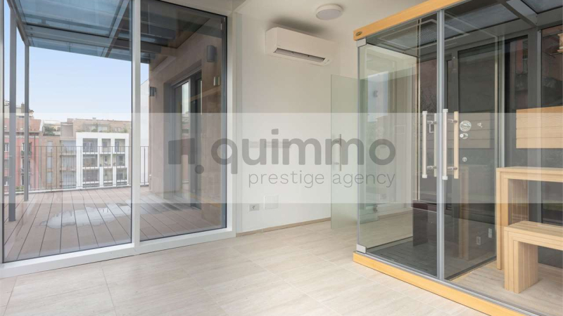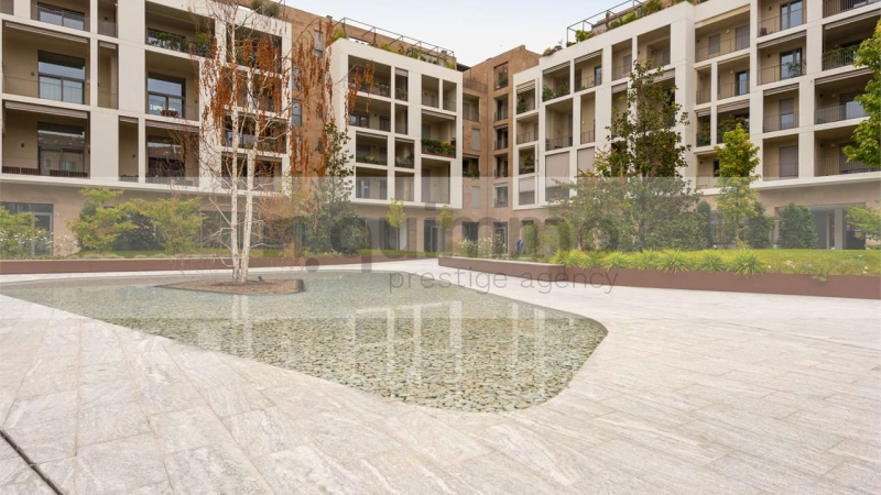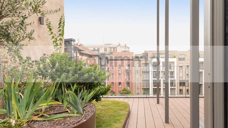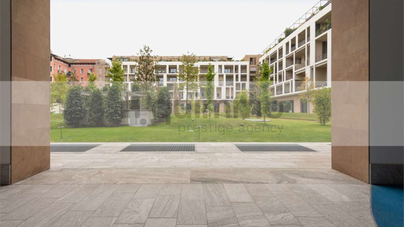 Distribuita su due livelli collegati da scala interna, la residenza accoglie al quinto piano una zona giorno di grande impatto: un ampio living incorniciato da grandi vetrate si apre su terrazzi piantumati e su un suggestivo giardino pensile, creando una continuità naturale tra interno ed esterno. La cucina firmata Ernesto Meda, completamente arredata, dialoga con gli spazi con eleganza e funzionalità, mentre la zona wellness privata, con sauna e cromoterapia, trasforma la casa in un autentico rifugio di benessere. Completano il livello un bagno ospiti e un ingresso principale diretto da ascensore ampio e rappresentativo.