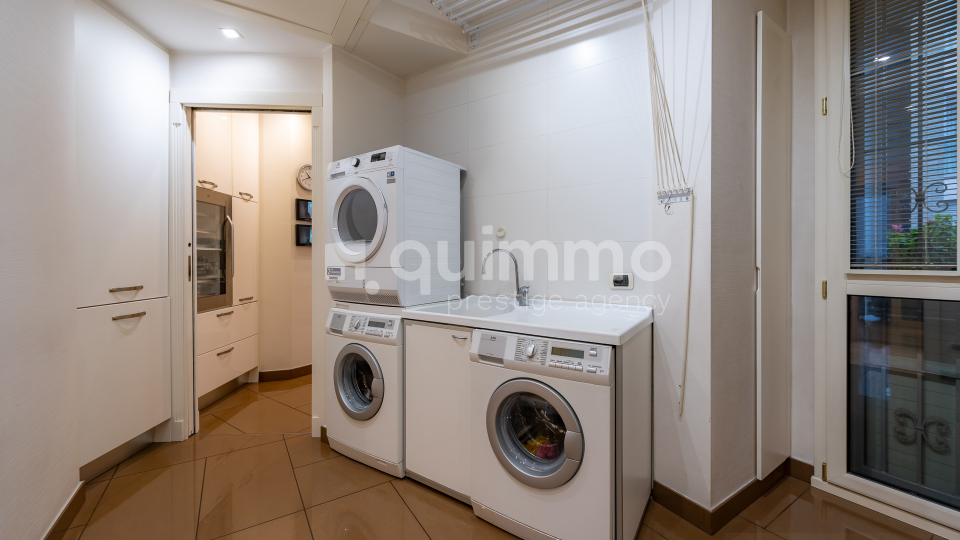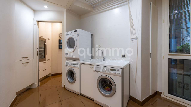 La cucina abitabile, concepita a livello professionale, è dotata di quattro forni, doppi fuochi e attrezzature di altissima gamma, pensate per soddisfare anche le esigenze più elevate. A servizio della casa si trovano una camera di servizio con bagno, una lavanderia/stireria e un comodo secondo ingresso indipendente.