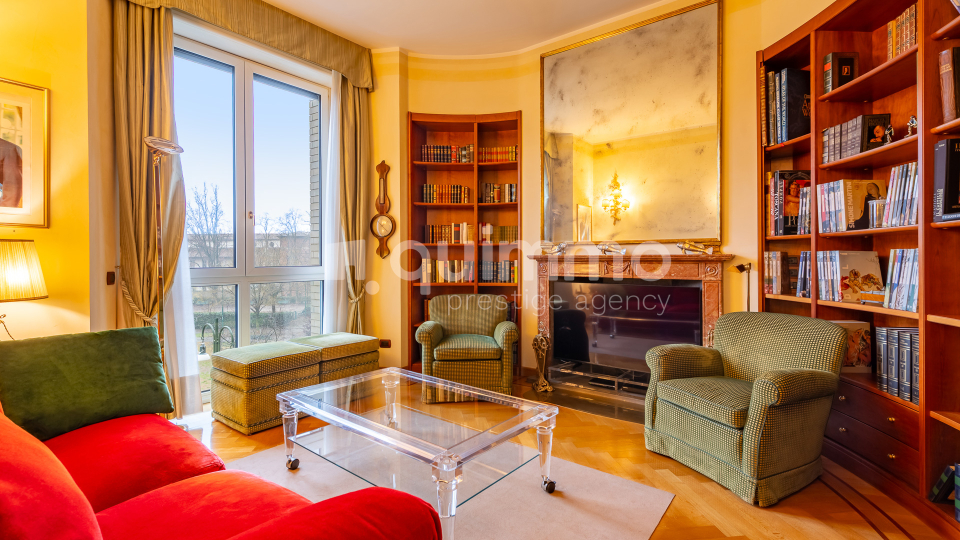 L’abitazione è caratterizzata da ampie porte-finestre presenti in ogni ambiente, che regalano una luminosità straordinaria e una vista aperta e continua sul verde del parco, creando un’atmosfera di rara bellezza e grande rappresentanza.