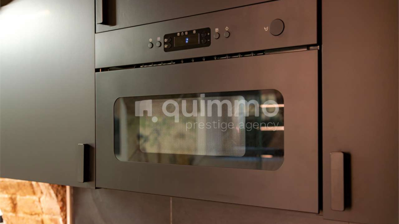 Accanto al soggiorno si trova la cucina, anch’essa protagonista della casa: un mix sofisticato di elementi contemporanei, mobili total black e piano in legno massello e dettagli storici, come la nicchia affrescata incastonata nella muratura. Un contrasto armonioso che cattura subito lo sguardo.