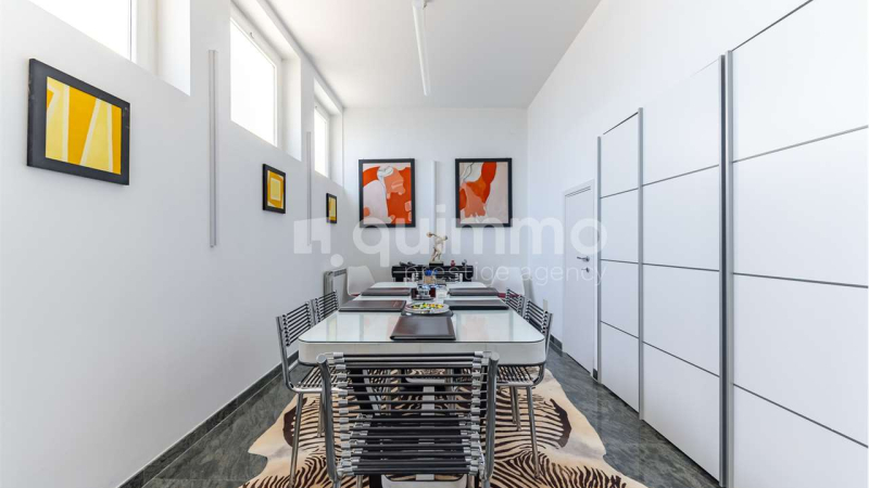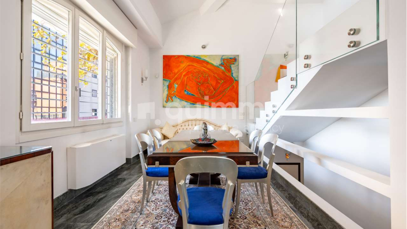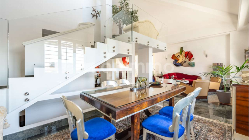 La dining room è valorizzata da un importante tavolo centrale, ideale per momenti conviviali e occasioni di rappresentanza, ed è incorniciata dalla presenza della scala di design con parapetti in vetro, elemento architettonico di forte impatto estetico che conferisce leggerezza e modernità all’intero spazio. La scala diventa così non solo un collegamento verticale, ma un vero segno architettonico che dialoga armoniosamente con l’ambiente circostante.