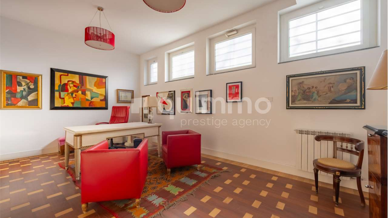 Al piano inferiore si sviluppa attualmente un’area dedicata ad uso ufficio di rappresentanza concepita come spazio ampio e luminoso, caratterizzato da ambienti ben proporzionati e facilmente modulabili. La distribuzione interna, unita alla presenza di finestre che garantiscono luce naturale e privacy, rende il piano estremamente versatile e adatto a molteplici interpretazioni.