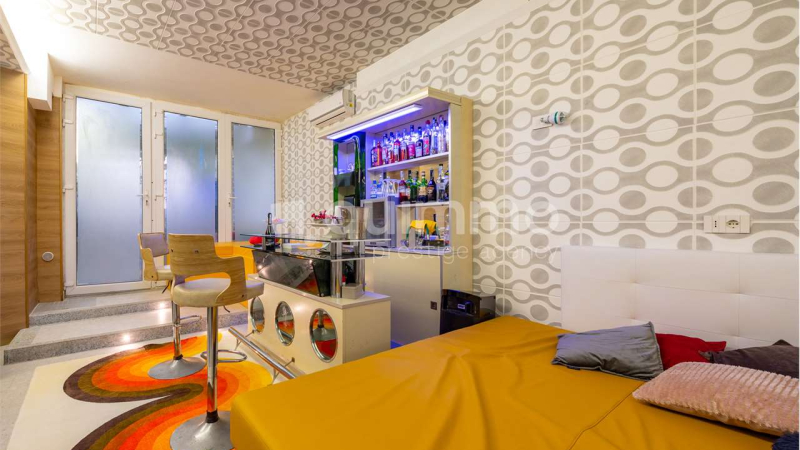 La proprietà comprende inoltre una ambiente accessorio dal carattere esclusivo, concepito come spazio divertimento autonomo e flessibile. Trovano posto una sala con divani giganteschi, meravigliosa angolo bar e area musica, doccia a vista walk in. Il piano è completato da una lavanderia separata, funzionale e ben organizzata, dispensa e ripostigli.
